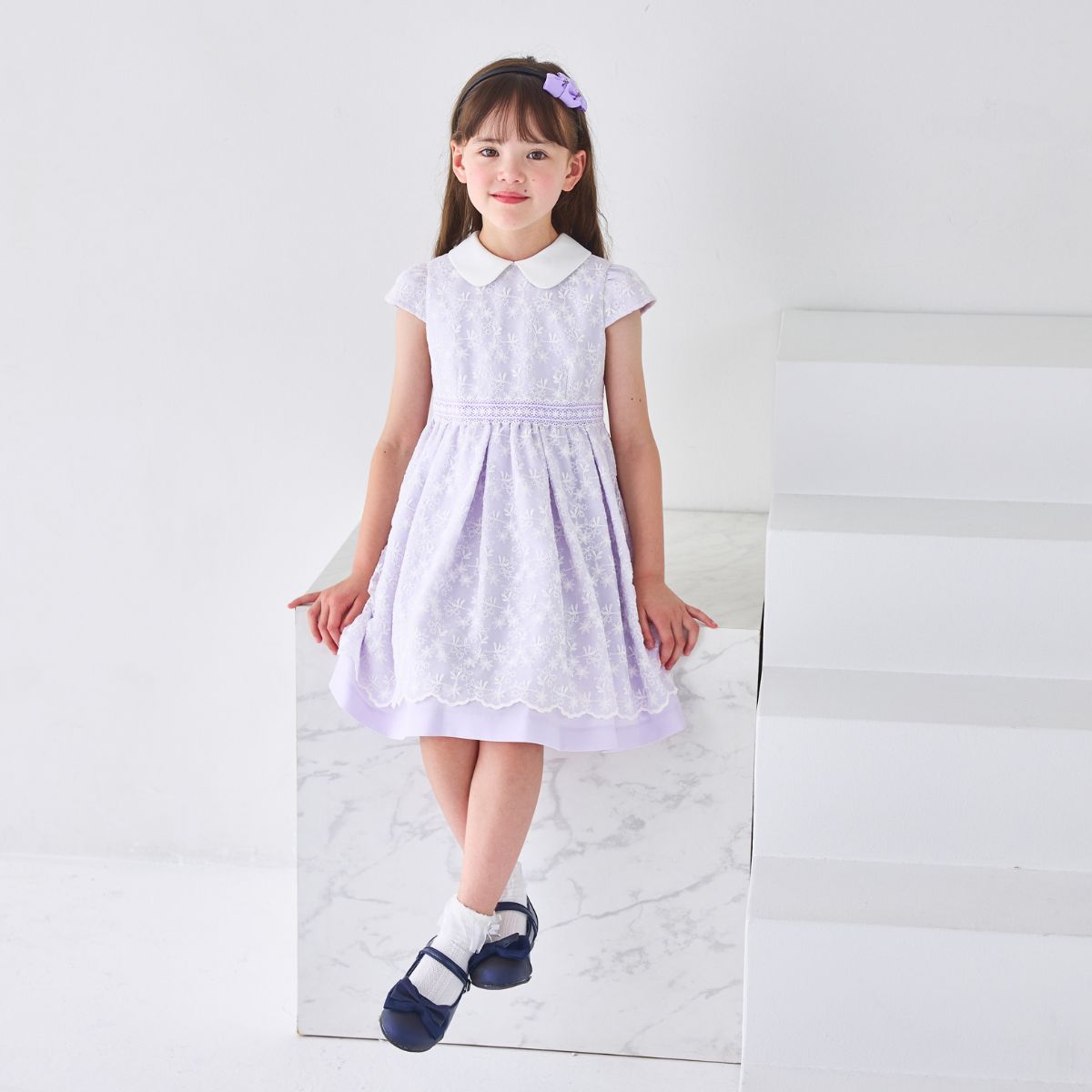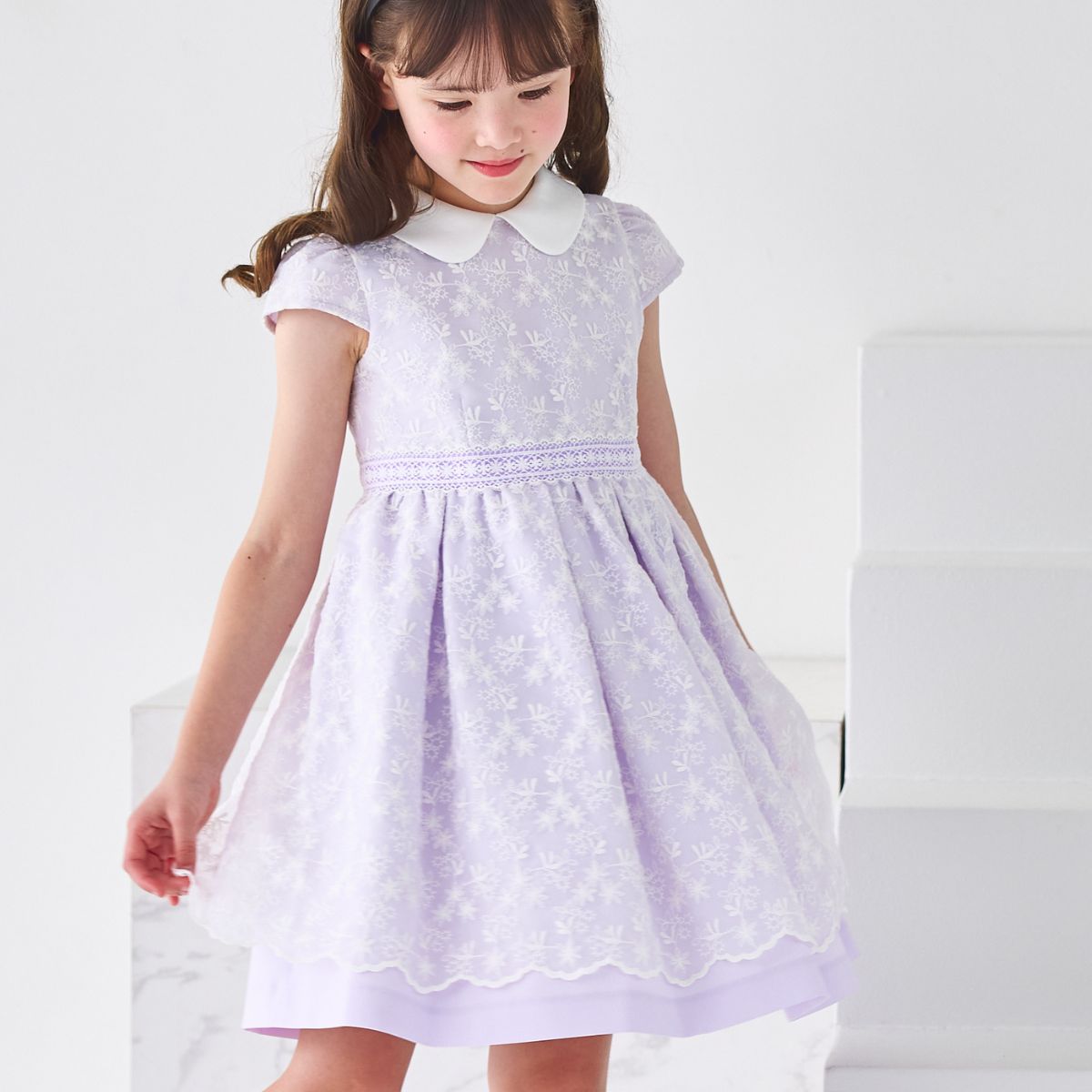 やさしいニュアンスカラーをベースに、繊細なレースをあしらったワンピースが清楚で可愛らしい印象。