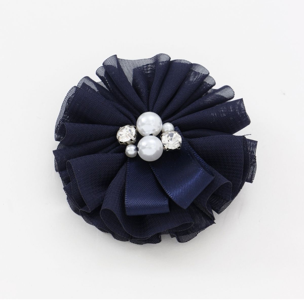 さらに、オーガンジーで仕立てたネイビーの花にパールをあしらったコサージュが、可憐で上品な印象を引き立てます。