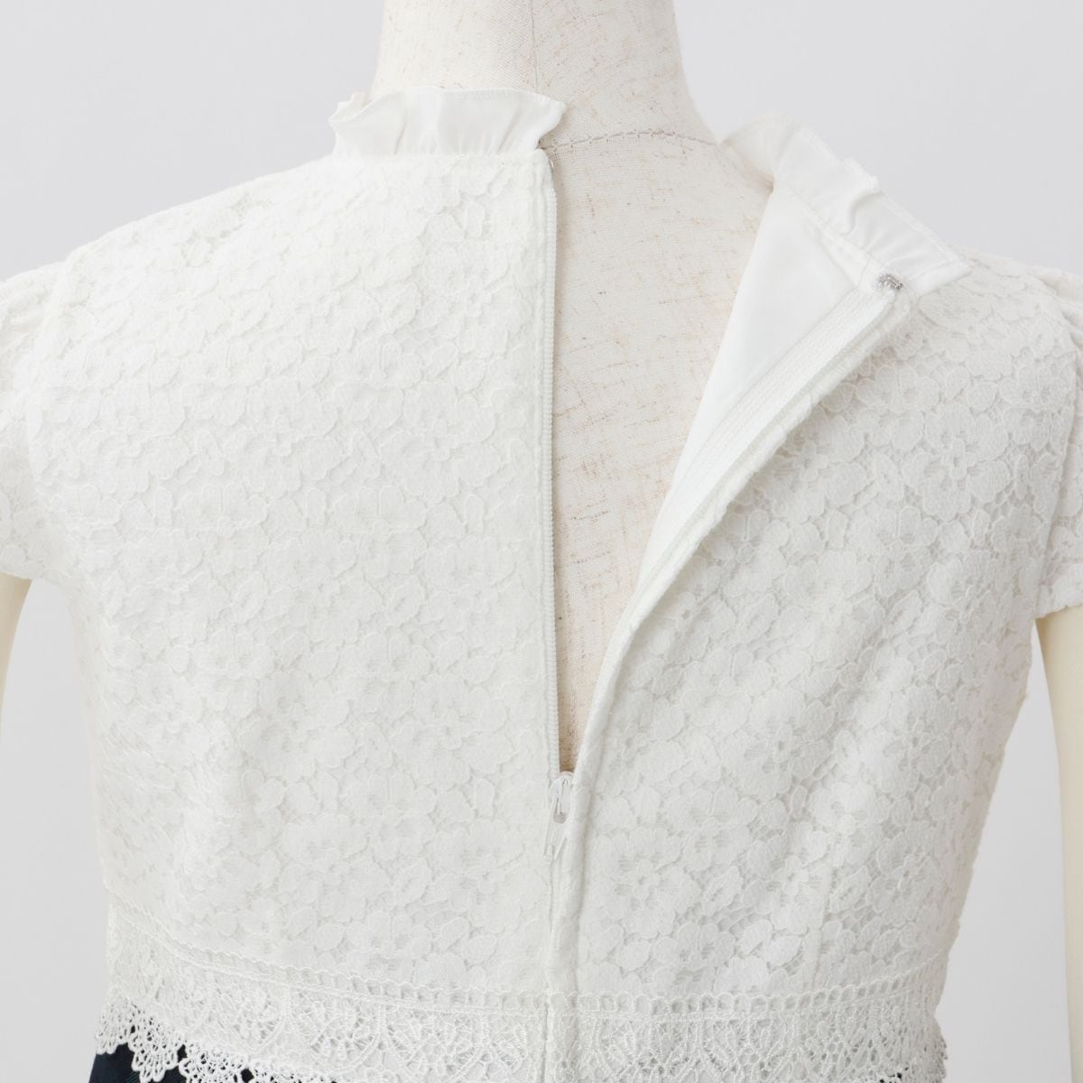ブラックウォッチのスカートに、華やかなレースをあしらった上身頃を組み合わせたワンピース。