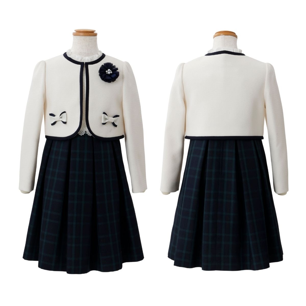 白地に配色パイピングを施したボレロを合わせ、すっきりと上品に仕上げたスーツセット。