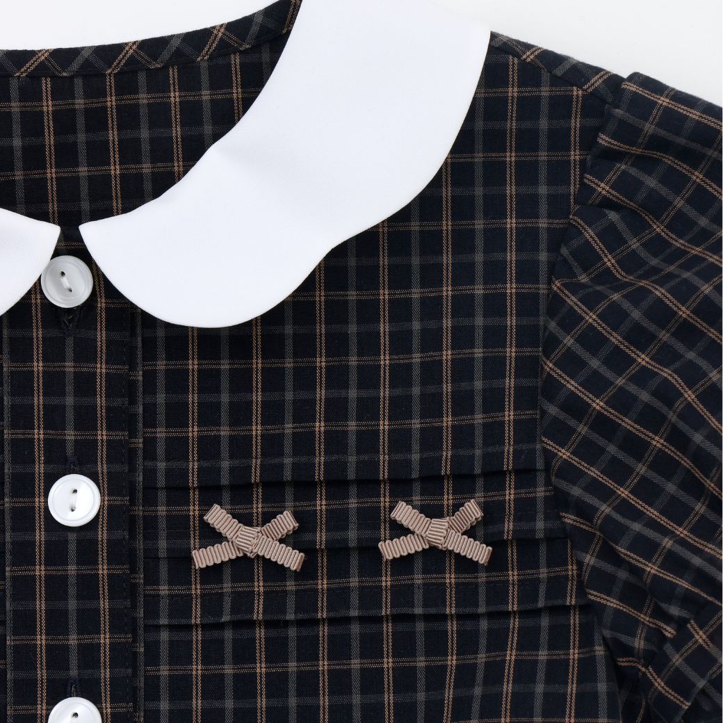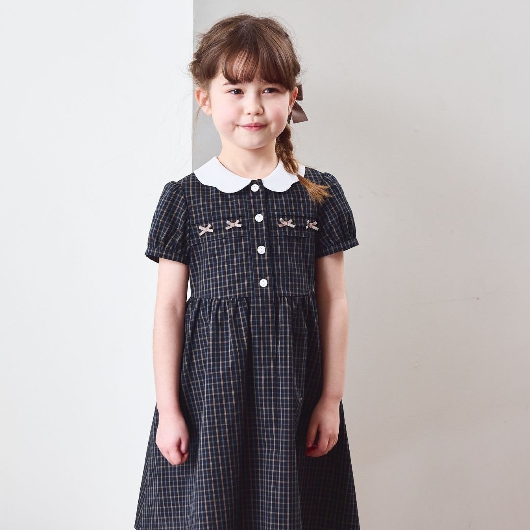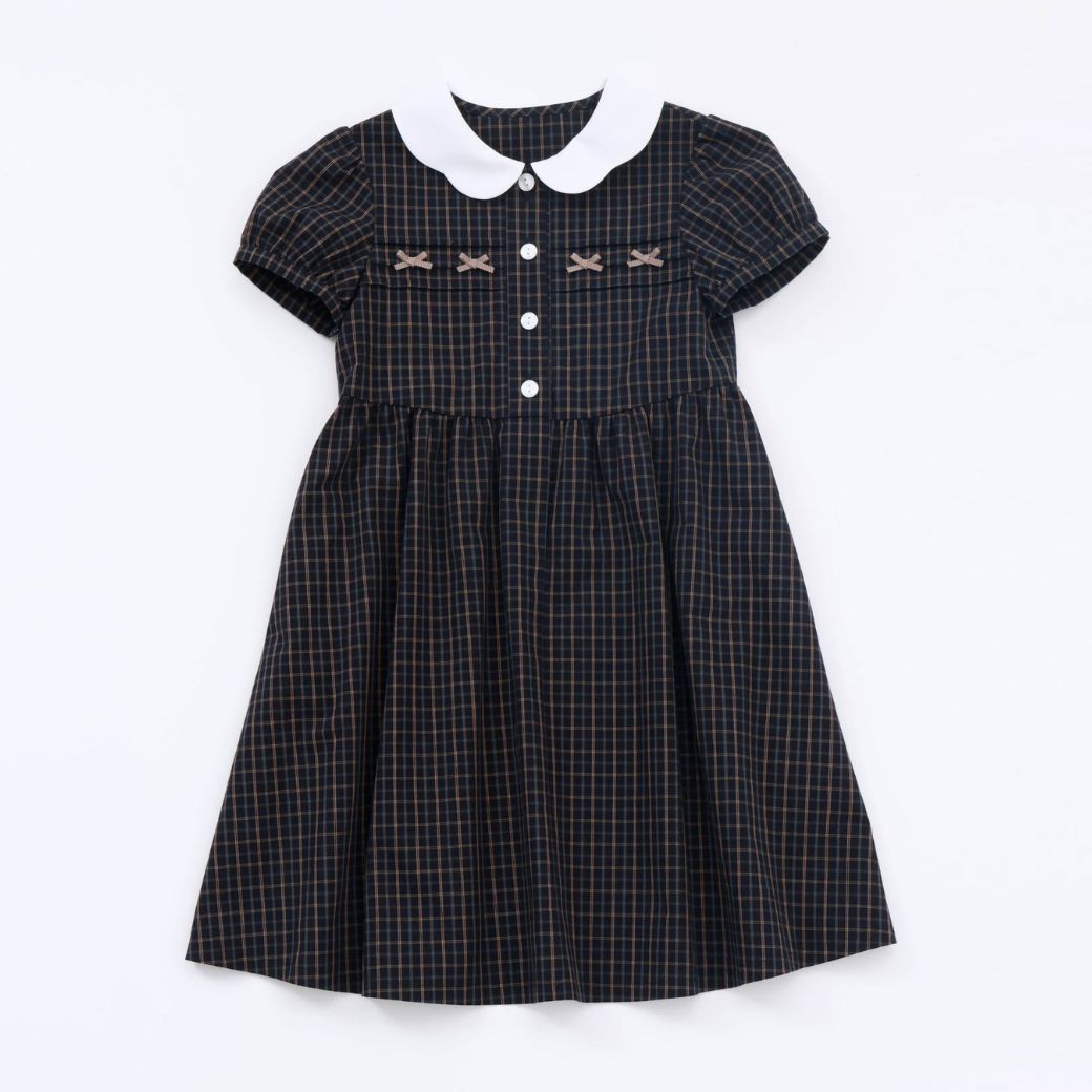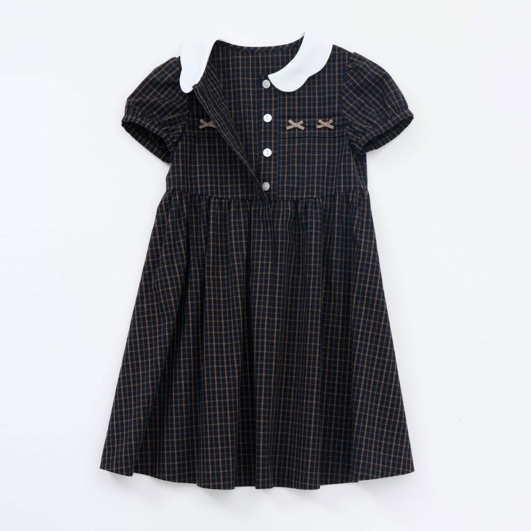 上品なダークチェックの身頃に、白衿のスカラップデザインをあしらったワンピース。