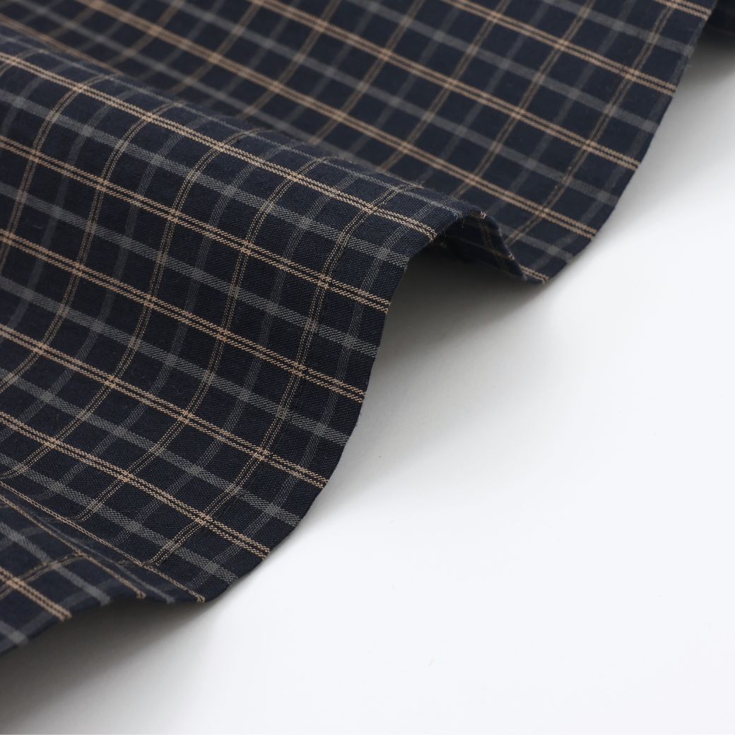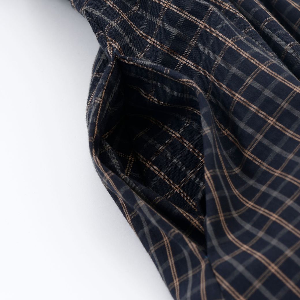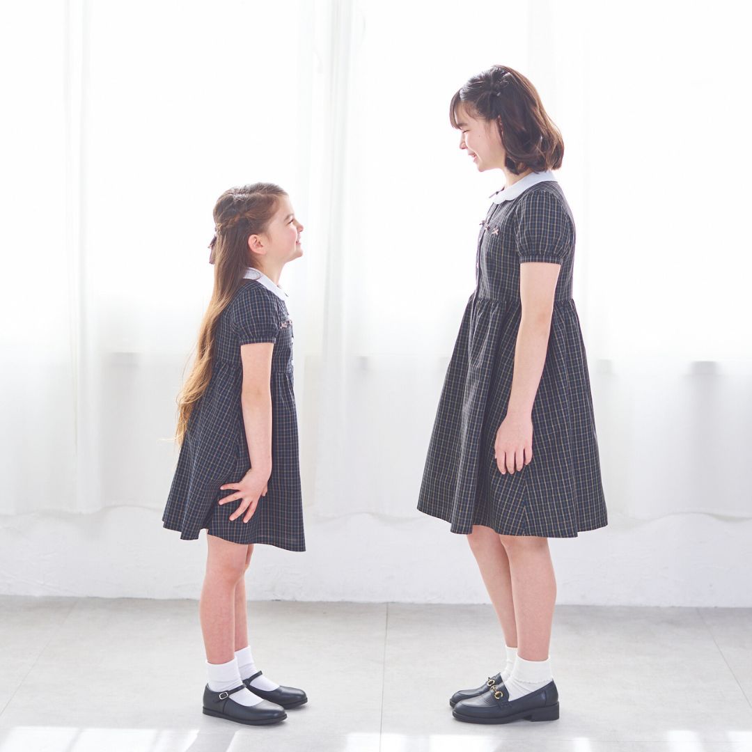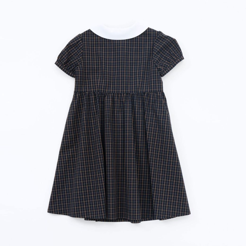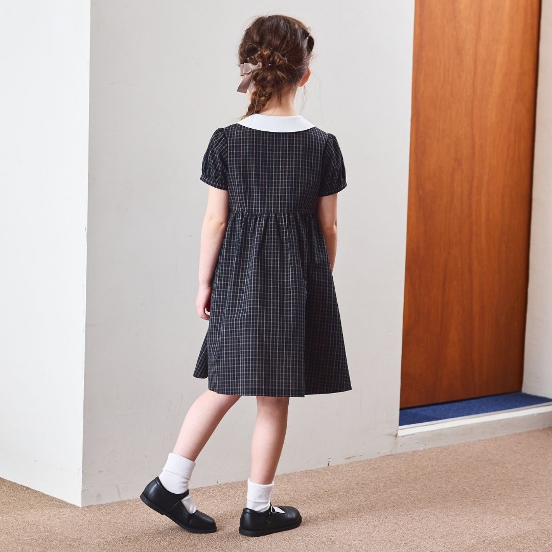 上品なダークチェックの身頃に、白衿のスカラップデザインをあしらったワンピース。