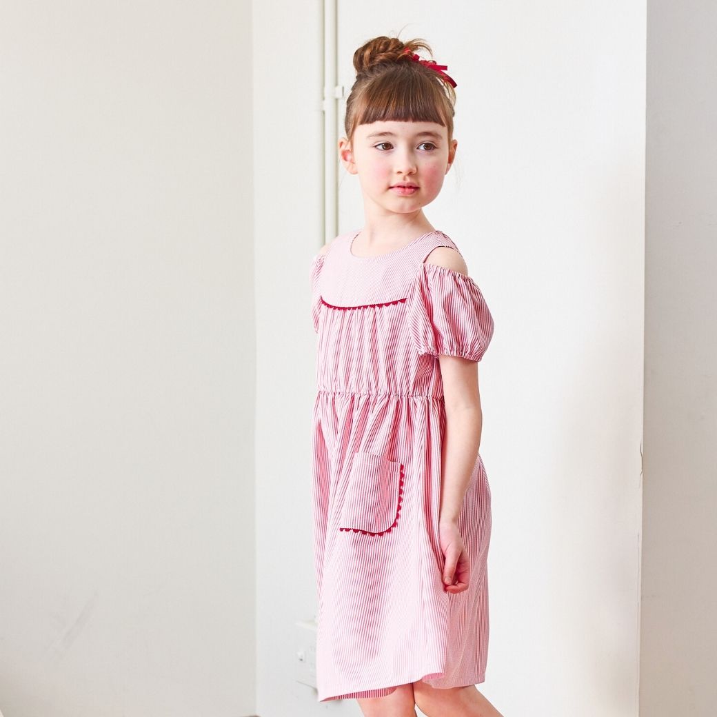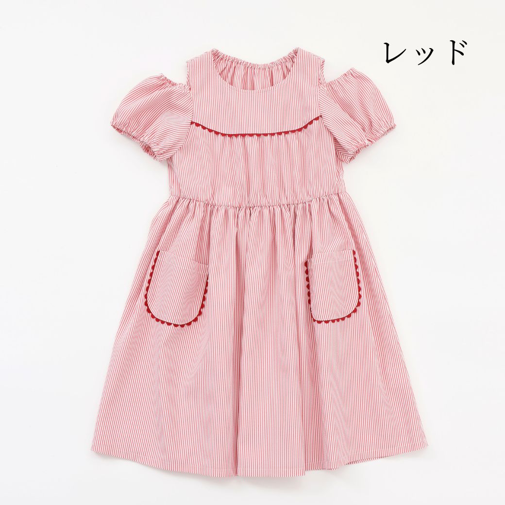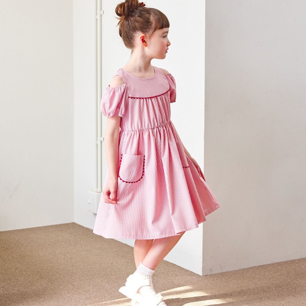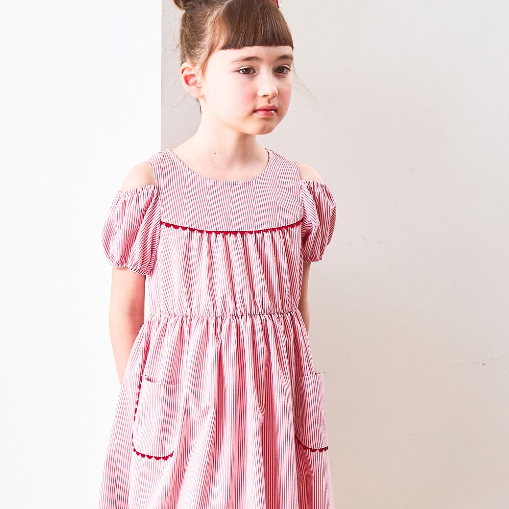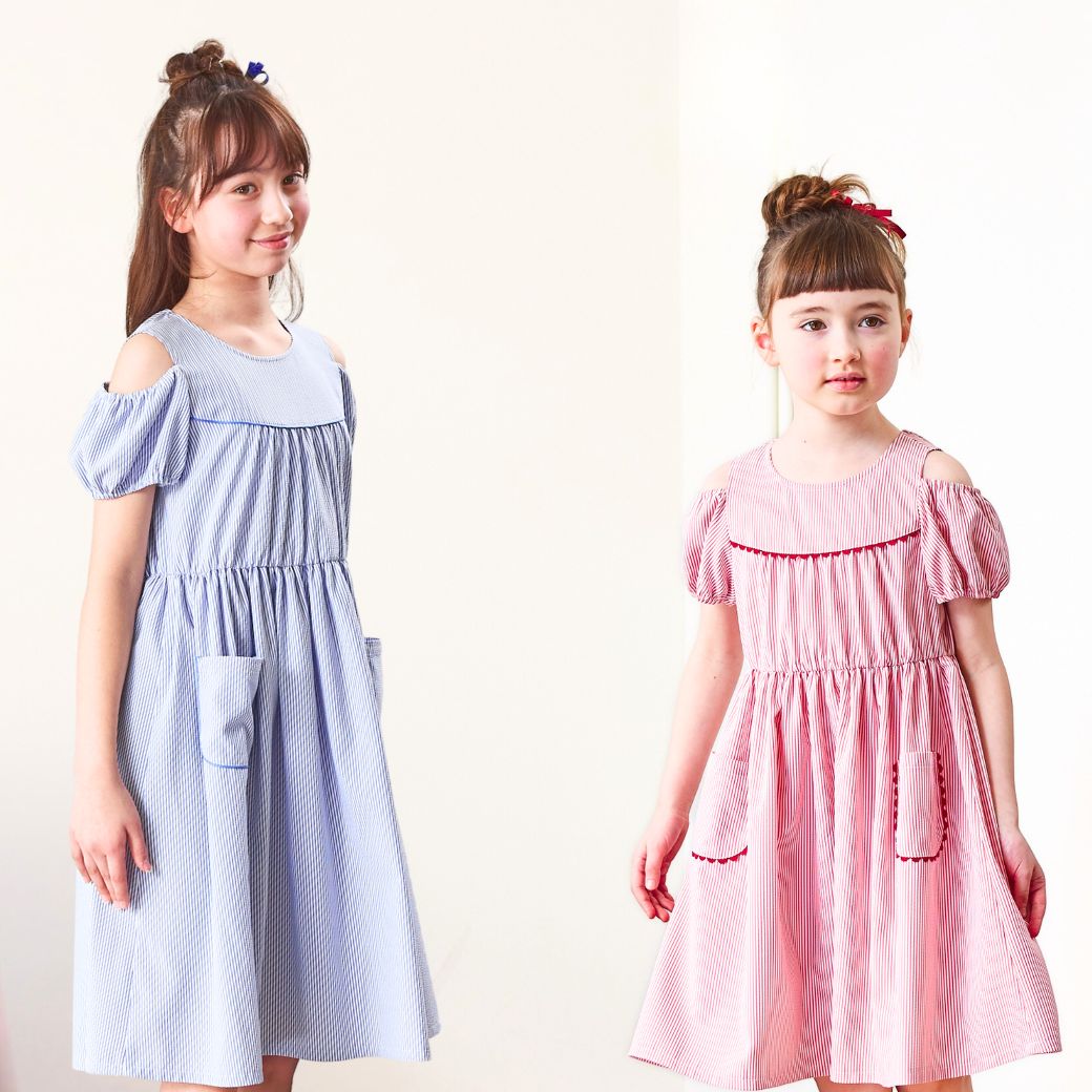 夏らしいインパクトのあるアカとブルーのストライプ生地で、肩出しデザインを取り入れた涼やかな一着。