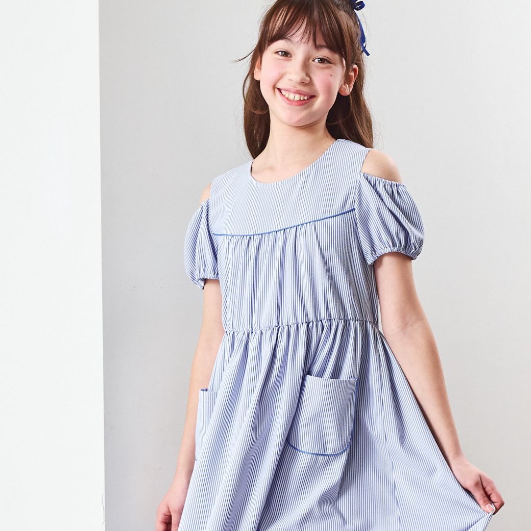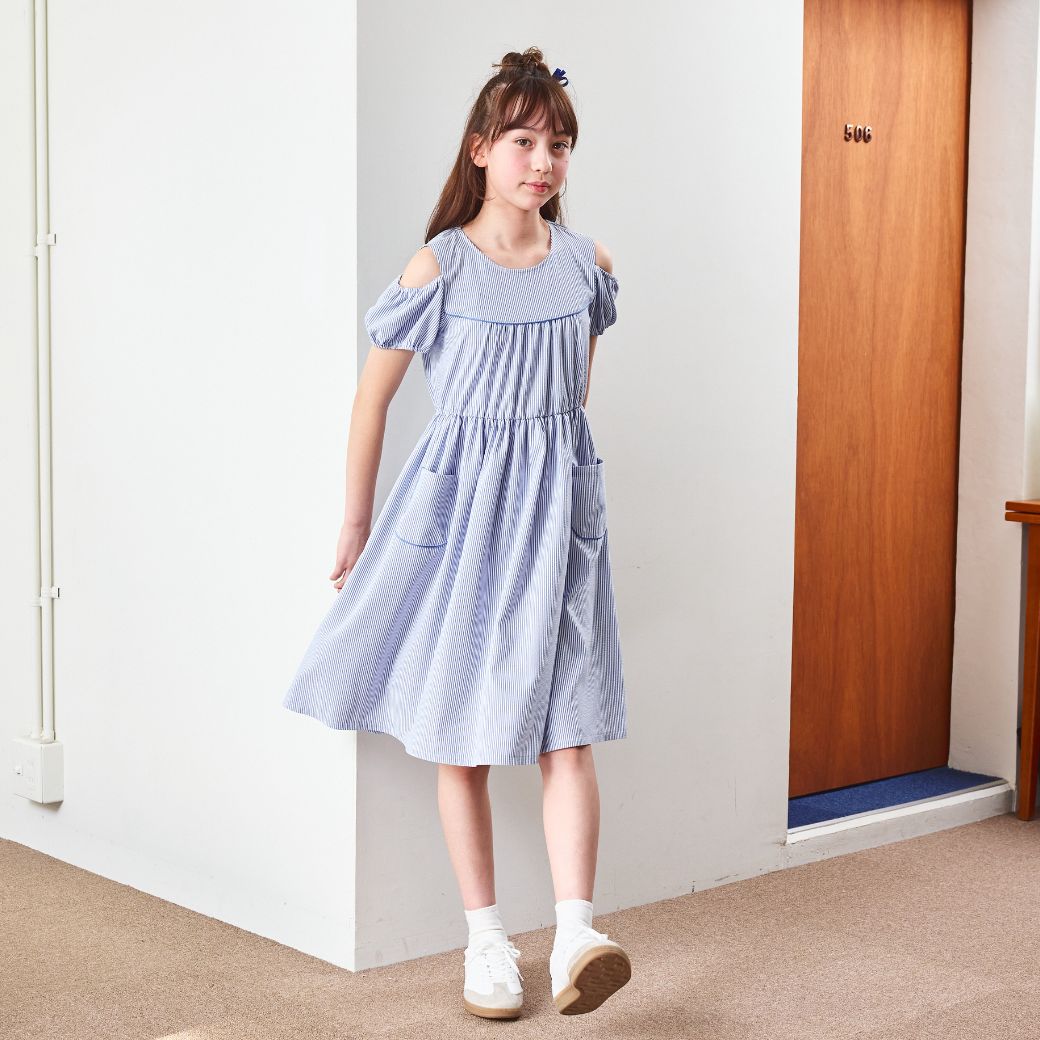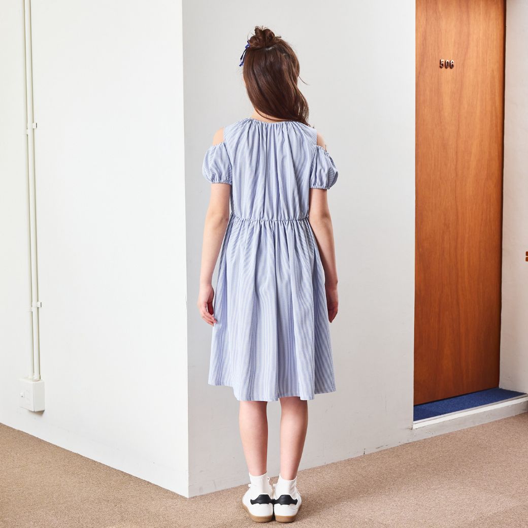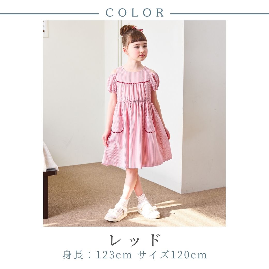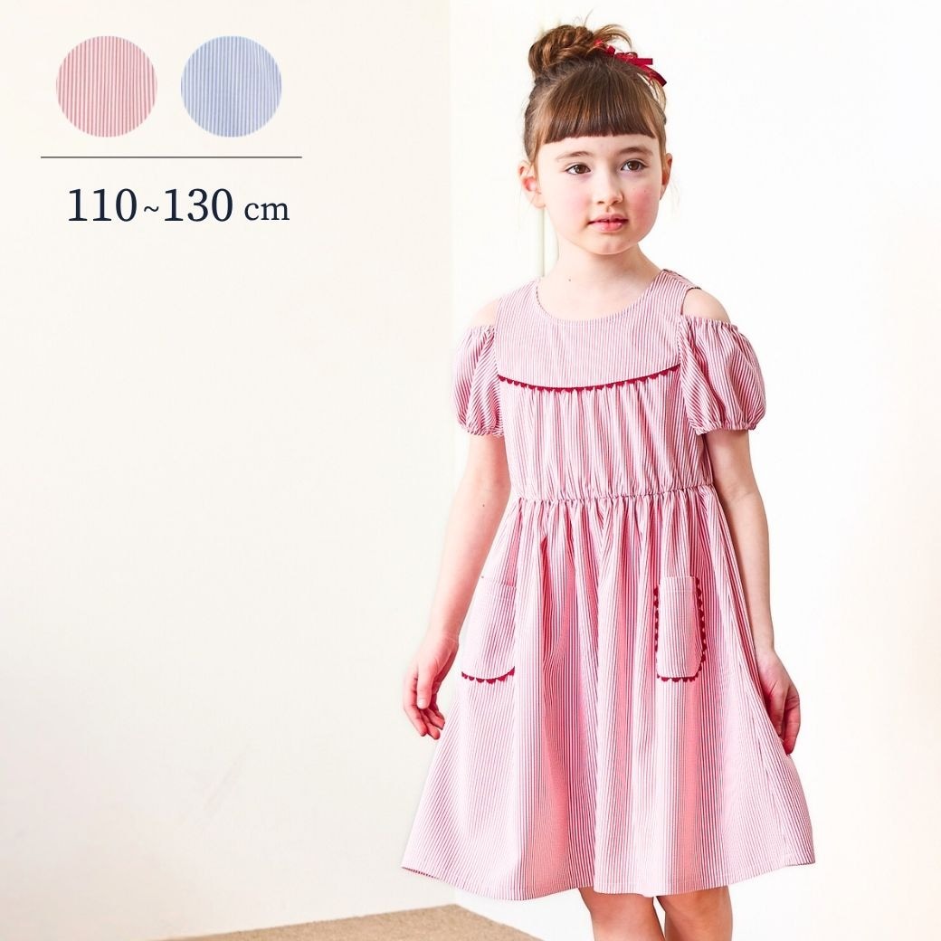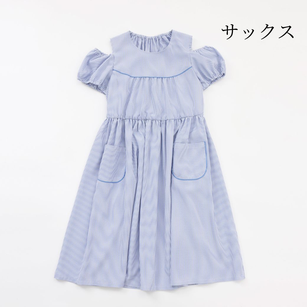 夏らしいインパクトのあるアカとブルーのストライプ生地で、肩出しデザインを取り入れた涼やかな一着。