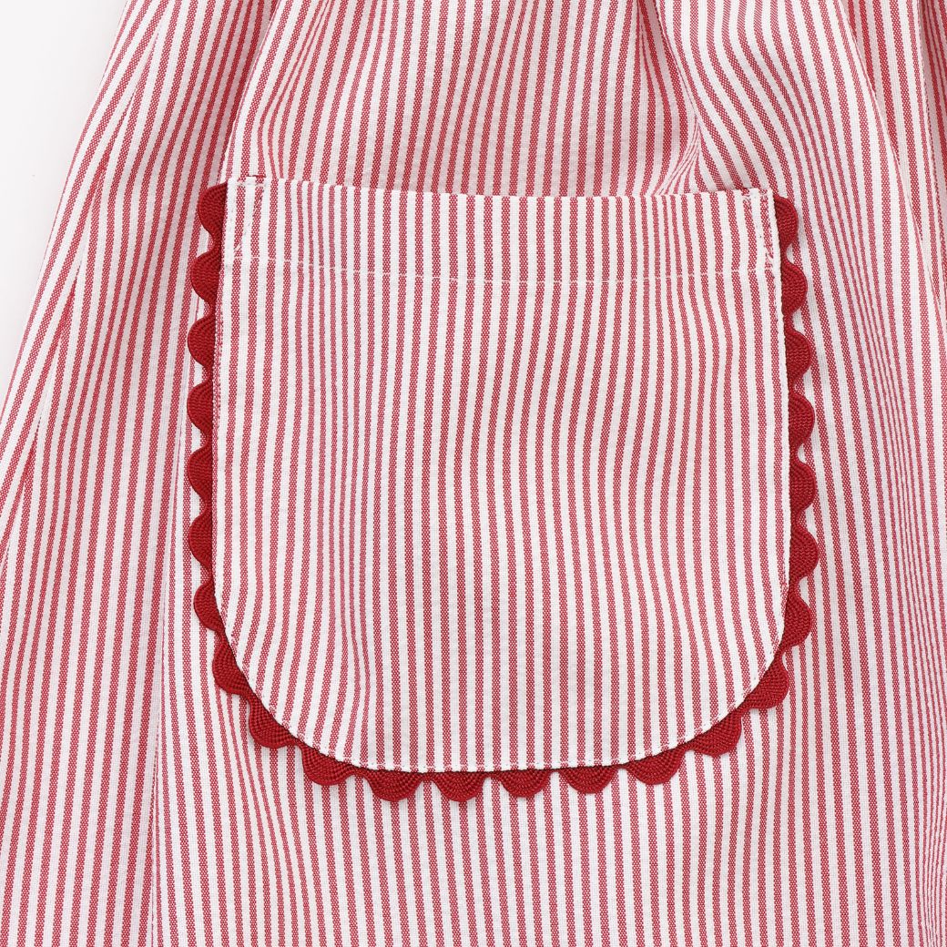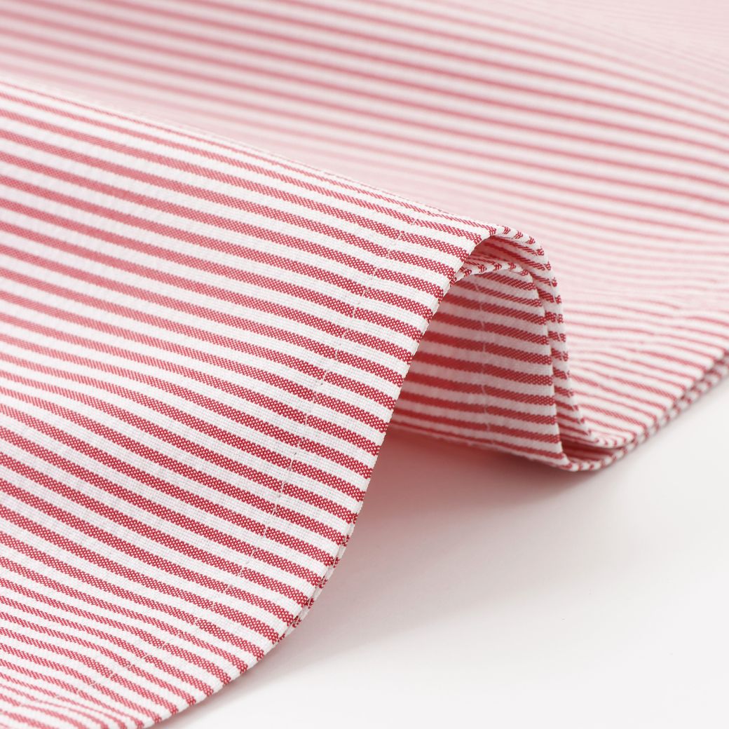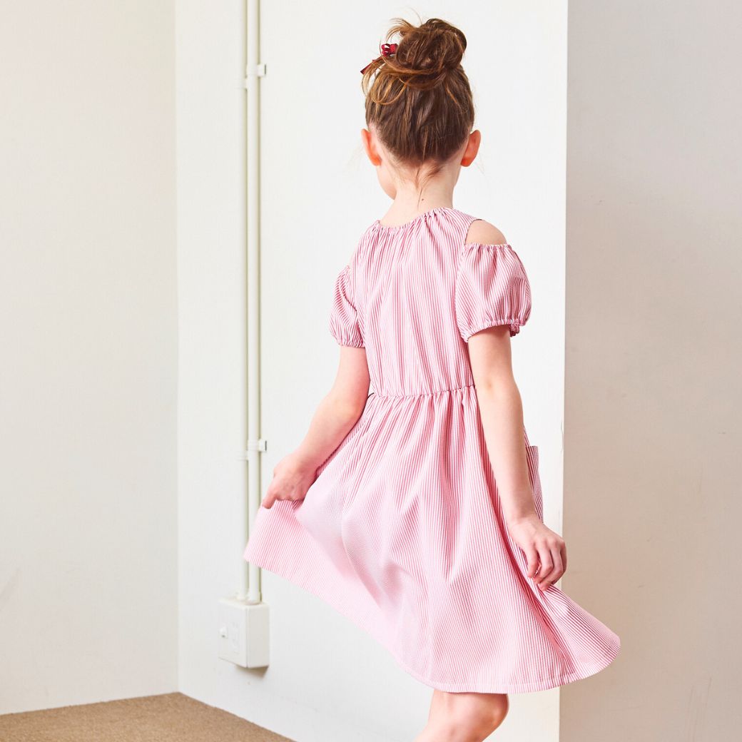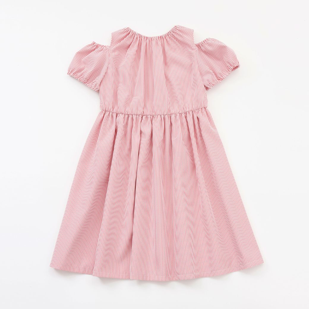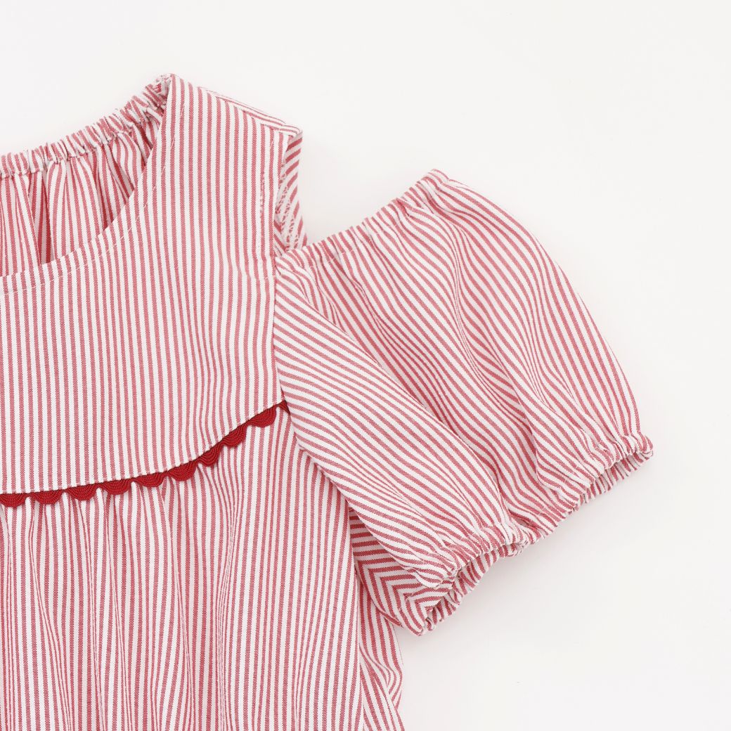 夏らしいインパクトのあるアカとブルーのストライプ生地で、肩出しデザインを取り入れた涼やかな一着。